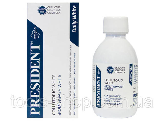 Ополіскувач для порожнини рота President White Plus має природну вибілювальну дію, даючи змогу водночас зберігати природний колір зубів завдяки ефективності рослинних екстрактів Ісландського моху або Арктичного Лісайника, а також особливого виду моху (Usnea Barbata). Цинк Хлорид і Цинк Цитрат запобігають осадженню нерозчинних солей, що перешкоджає утворенню зубного каменю. До того ж приємний аромат М'яти П'ємонте надає тривалу освіжаючу дію.