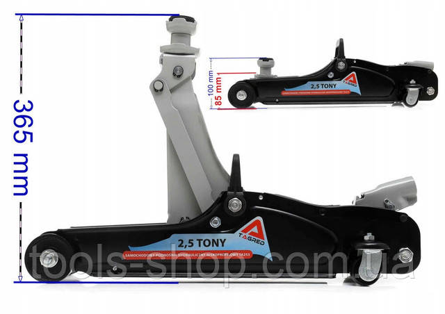 Незамінний у домашньому гаражі, а також в автомайстернях, шиномонтажі або на станції технічного обслуговування автомобілів — Низькопрофільний підіймач TAGRED вантажністю 2,5 тонни виготовлений із найкращих сталевих листів прокату, які об'єднані в спеціальні профілі, які покращують жорсткість конструкції. Дуже мала початкова висота робить підіймач TAGRED ідеальним для обслуговування будь-якого автомобіля, зокрема автомобілів із заниженою підвіскою — він пролізе навіть під легковий автомобіль із настроюванням зниження підвіски до 85 мм!